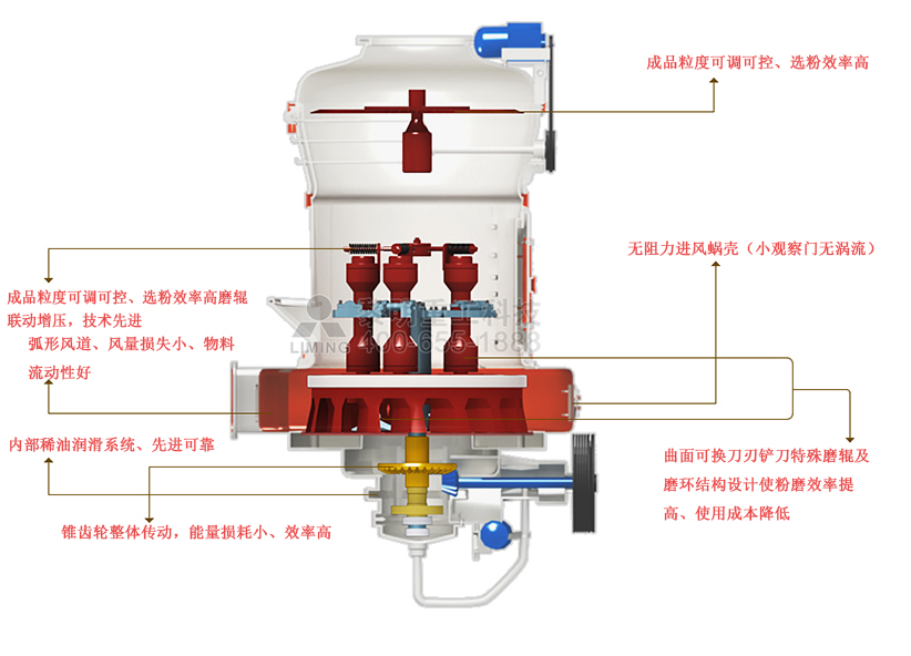 曲面可换刀刃铲刀,特殊磨辊及磨环结构设计使粉磨效率提高、使用成本降低